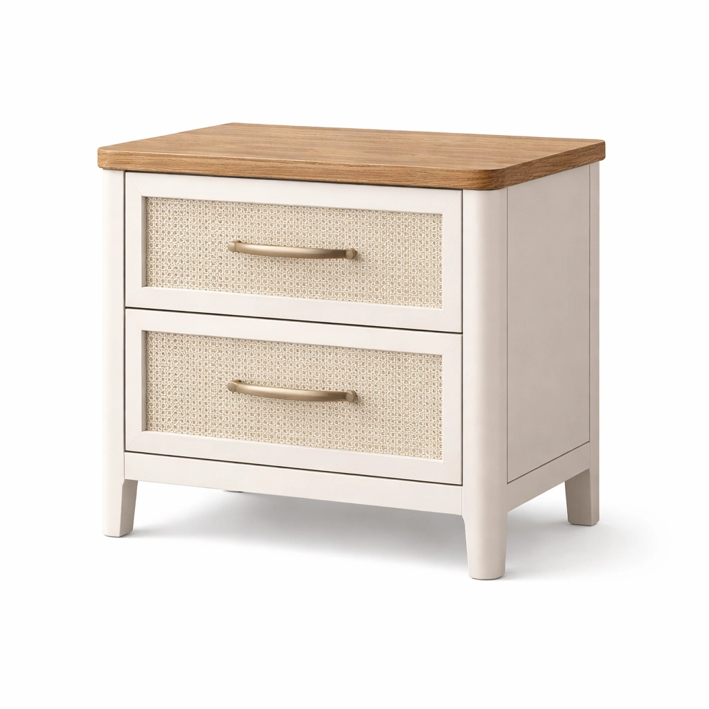 Material: Estructura de madera; Superficie de MDF y chapa de roble; Frentes de cajón tejidos de ratán